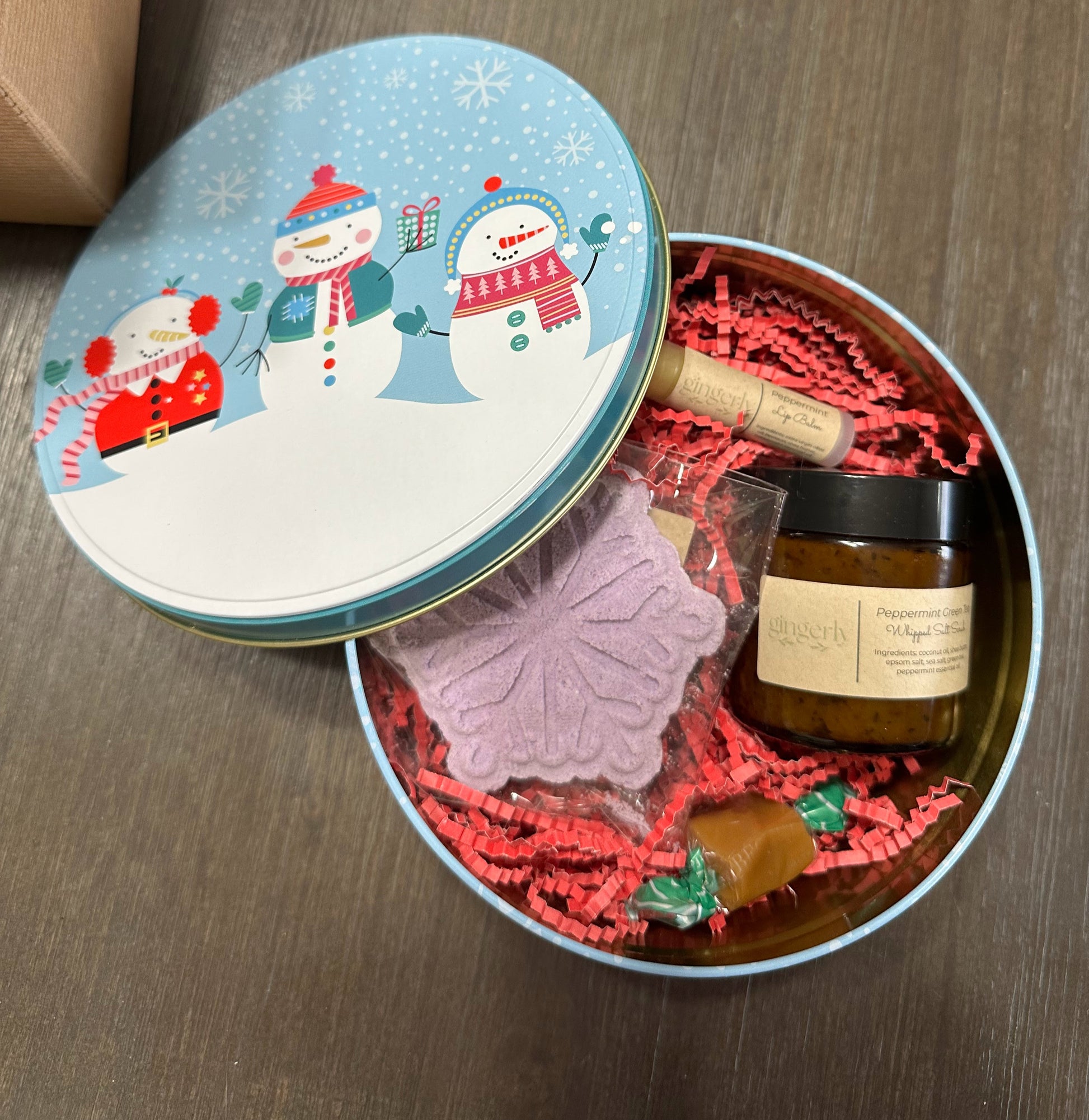 Each tin comes with a body scrub, bath bomb, lip balm, and caramel treat!